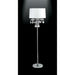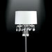 A brilliant white shade covers a cascading set of imported crystal droplets surrounding a metal base.