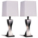 This distinctive table lamp set makes a sculptural statement with twisted metal bases and square tapered shades. The brushed silver finish enhances the fluid form, adding movement and depth to the contemporary profile. Each lamp is grounded by a matte black pedestal base for contrast and stability. Perfect for bedrooms, living rooms, or offices, this matching set delivers balance, symmetry, and visual intrigue to any modern interior.