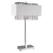 A dark black shade with hanging crystals is the focus of this rectangular lamp.