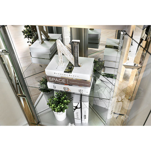FurnitureOfAmericaLet this chic curio cabinet make a dramatic statement in your contemporary home with its brilliant silver finish! The mirrored accents decorating t...