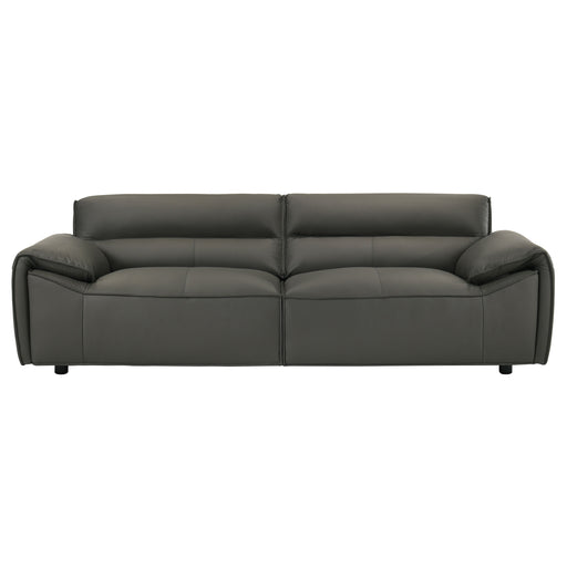 CoasterSleek and sculptural, this leather-upholstered sofa blends minimalist form with elevated comfort. Wrapped in 100% genuine top grain leather, it off...