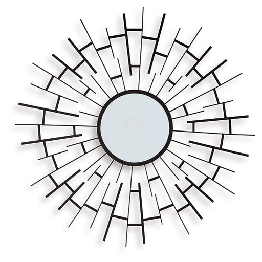 Signature Design by Ashley®This accent mirror makes a bold statement in contemporary and industrial spaces. Framed with sunburst-style metal fretwork and finished in a luxe b...