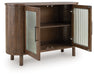 Details Made with solid mango wood, Back made with mango wood veneer and engineered wood substrate, Medium brown finish, Black metal door pulls, 2 doors with fluted glass inserts, 1 fixed shelf, Openings in back for electronics, Minor assembly required, simply lay flat and attach feet, Assembly required