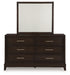 | Details | B618B5: Includes upholstered panel headboard, panel rails and panel footboard with slats, Made with hardwood solids, engineered wood and MDF substrates, Grayish brown wood-tone finish, Floating inset upholstered panel in polyester Next-Gen Nuvella fabric surrounded by LED backlight, Next-Gen Nuvella™ is a performance fabric that is soft, easy to clean, stain-resistant and durable, Clean fabric with mild soap and water, let air dry; for stubborn stains, use a solution of 4 oz. bleach to 28 oz. water, Light switch is located on each side of headboard and includes dual USB charging port (USB-A and USB-C), Power cord included; UL Listed, Foundation/box spring required, sold separately, Mattress available, sold separately, Assembly required, B618B1: Includes dresser and mirror, Made with hardwood solids, engineered wood and MDF substrates, Grayish brown wood-tone finish, Metal bar pulls with satin nickel-tone finish, 6 smooth-gliding drawers with dovetail construction and heavy duty ball-bearing side glides (top drawers felt lined), Mirror attaches to back of dresser, B618-46: Made with hardwood solids, engineered wood and MDF substrates, Grayish brown wood-tone finish, Metal bar pulls with satin nickel-tone finish, 5 smooth-gliding drawers with dovetail construction and heavy duty ball-bearing side glides (top drawers felt lined), B618-92: Made with hardwood solids, engineered wood and MDF substrates, Grayish brown wood-tone finish, Metal bar pulls with satin nickel-tone finish, 2 smooth-gliding drawers with dovetail construction and heavy duty ball-bearing side glides (top drawers felt lined), | |