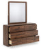 Grace your restful retreat with an added dose of refinement. This dresser with mirror showcases a stunning rich brown wood tone, with sleek drawer pulls for an added layer of luxury. A rounded top and mirror frame soften the silhouette, elevating the look. It’s curated, contemporary and utterly chic.