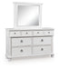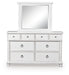 | Details | Includes dresser and mirror, Dresser made with hardwood solids, veneers and MDF substrates , Mirror made with solid wood, Rubbed antiqued white finish, Metal hardware with pewter-tone finish, 8 smooth-gliding drawers with fully finished interiors, French/English dovetail construction and heavy-duty ball-bearing side glides, Top drawers felt lined, Mirror attaches to back of dresser | |