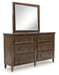 Details Includes dresser and mirror, Made with hardwood solids, veneers and MDF substrates, Brown finish, Oil-rubbed bronze-tone knobs, 6 drawers with fully finished interior, dovetail construction and heavy duty ball-bearing side glides (top drawers felt lined), Turned feet, Mirror attaches to back of dresser