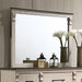 This bedroom set will fit in well in a Mediterranean-inspired space. The mirror features fluted panels and columns topped with foliage details reminiscent of classical architecture. The color palette hints at history as well--the antique white finish partnered with the gray top pieces lends a unique kind of worn-out charm.