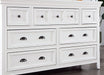 Take serenity home with this dresser from the Castile collection. Topped with beautiful crown molding details, the bold panel drawers are window pane-inspired. Finally, the finish and the nickel cup pulls and round knobs complement each other well in tone and hue.