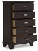 Details Made with hardwood solids, engineered wood veneer and MDF substrates, Dark brown finish, Metal bar pulls with bright nickel-tone finish, 5 smooth-gliding drawers with dovetail construction and metal center guides, Drawer interiors are lined with a wood grain laminate for a clean, finished look, Top moulding