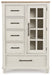 This door chest elevates the art of modern farmhouse design. Its two-tone aesthetic blends antiqued white and light grayish brown for a charming finish. Framed drawer fronts and a windowpane door lend a country feel. Conveying a feeling of relaxed comfort, the chest is sure to carry you away to a dreamy time and place.