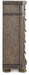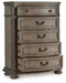 Details Made with hardwood solids, oak and ash veneer, MDF substrates and cast resin components, Top with inlaid ash veneer border, Light brown finish with glazed antiqued look, Metal hardware with aged bronze-tone finish, 5 drawers with fully finished interior, dovetail construction and heavy duty ball-bearing side glides (top drawer felt lined)