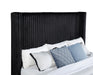 • California king bed with tall wingback frame and vertical channel tufting in black velvet