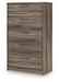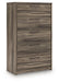 Casually cool style and lots of storage go hand in hand with this chest of drawers. A weathered brown finish over replicated oak grain creates an easygoing vibe, setting the scene in your restful retreat. Clean lines and modern handles provide a fuss-free look. And the chest's five roomy drawers give you plenty of space for stowing away clothes and more.