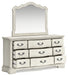 | Details | B980B4: Includes headboard, footboard and rails, Made with hardwood solids, spruce veneer, MDF substrates and cast resin components , Antiqued white painted finish, Polyester upholstery, Button tufting, Foundation/box spring required, sold separately, Mattress available, sold separately, Assembly required, B980B1: Includes dresser and mirror, Made with hardwood solids, spruce veneer, MDF substrates and cast resin components, Antiqued white painted finish, 9 drawers with fully finished interiors, French and English dovetail construction and ball-bearing side glides, Metal bar pulls with aged pewter-tone finish, Mirror attaches to back of dresser, | |