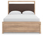 The natural wood tones and clean lines of this queen upholstered platform bed echo your easygoing style sensibilities. With a warm finish and replicated oak grain, its carefree character lightens up your bedroom. Curved inner corner details soften the look, while contrasting brown fabric modernizes the feel. And for added function, warm LED lighting adds serene ambiance at the touch of a button.