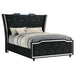 • Queen bed upholstered in a black velvet with tufted wingback silhouette