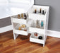 This vanity shines above the rest with functional details, like the tri-fold mirror with 10 light bulbs and a variety of spaces for staying organized and tidy. On the right side, a movable shelf with casters open up for your personal things, while the left drawer pulls out to reveal a two-tier shelf. There's plenty of room on top with a spacious corner layout and shelving. A glamorous white finish tops off this beautiful piece for your daily routine.