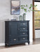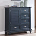 Gorgeous lines and a grand silhouette give this bedroom furniture a distinctive edge. The nickel hardware which comes in knobs and cup pulls adds a slight sense of fancy. Molding details on each case good's front give it a country twist that's amplified by the bold slate blue finish.