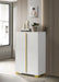 Minimalism never looked so elegant as it does in this elegant five-drawer chest, an excellent option for your updated bedroom ensemble. Modern design details produce a chic vertical chest with an Art Deco vibe and tons of storage space. Made of wood products, this five-drawer chest features a versatile finish with accenting from gold finish metal, placed carefully to emphasize a geometric linear effect. Store incidentals and accessories in drawers operating smoothly on center metal glides. English dovetail drawer construction embellishes this chest’s quality, as vertical gold metal drawer hardware offers a unique impact.
