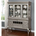 You can't go wrong with glamour and glitz! This champagne finished dining collection is balanced with smooth wood framework and charming tufted side chairs. The round table top is balanced upon flared angular legs and masks the open bottom shelf, which is perfect for storing napkins, salt and pepper shakers and other dining accessories. Padded faux leather upholstery comes adorned with crystal-like acrylic buttons, emphasizing the scroll backs and elegant designs.