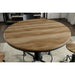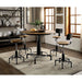 Tall, dark and handsome has a new meaning thanks to this daring two-tone dining set. Warm wood veneer is balanced as sand black coloring add sleek finishes to the metal framework. The pipe-inspired design adds edgy industrial tones while hand-painted copper delivers a rustic touch. Rest easy on the curved back chairs and kick your legs up for additional comfort.
