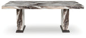 This dining table reflects your highly contemporary point of view. Its faux marble tabletop and base are a feast for the senses—white contrasts against the light and dark brown veining to create an elevated, authentic feel. With room to seat eight people in sleek style, this table is a delicious choice for an elegantly elevated dining area.