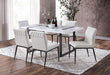 Metal and wood collide in this contemporary set with a unique metal base, which extends through the table top, creating what looks like lines traversing a sea of white. The contrast between the dark metal and the glossy white creates a unique geometric motif. Paired with the beautiful diamond tufting and sharp, tapered legs on the matching chairs, it's modern with a subtle hint of retro vibes.