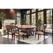 This dining set has irresistible style with the addition of functional storage space. With wine always within arm's reach this dining table will quickly become a favorite, and the 18" expansion leaf will ensure there is enough room for everyone at the table. The corresponding dining chairs have the same brown cherry finish, with a nailhead trim along its padded seat. The slatted backing looks delicate while enhancing the homesteading vibes of this lovely collection.