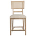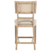Elevate your dining experience with this stylish counter-height chair, combining natural beauty and modern comfort. Crafted from solid wood, this chair features a hand-woven radio weave cane backrest that adds a light and airy feel to your space. The foam seat cushion, upholstered in soft beige fabric, ensures comfort while dining or entertaining. Designed with clean lines and sturdy construction, this counter-height chair also includes a footrest with a brass-finished metal kick plate for added durability. Perfect for pairing with your counter-height dining table or kitchen island, this chair blends timeless elegance with practical functionality.