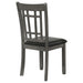 A combination of vertical and horizontal slats creates a window pane effect for this charming transitional dining chair. An armless silhouette is a versatile choice for relaxed, everyday living. The chair boasts a medium grey finish over rubberwood construction. Webbed seating and black faux leather upholstery combine for stylish comfort. Invite friends and family to have a seat and enjoy a lovely meal.