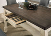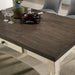 Create a sense of comfort with this vintage ivory and dark gray table supported by turned legs. A sole storage drawer offers easy access to utensils, while the open bottom shelf is the perfect spot to display and conveniently store dinner wares. The matching bench and chairs are padded and upholstered in gray fabric, which offer a nice contrast to the lighter wood finish.