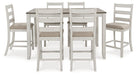 Set the scene for coastal chic or modern farmhouse living with this counter height dining set. The clean-lined, simply striking table doubles the charm with a brown plank effect top, paired with a grayish white base with a rub through effect for timeworn appeal. Six bar stools with classic ladderback styling and comfortably upholstered seats make room for one and all.