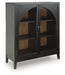 If your love of entertaining is only surpassed by your love of sleek, versatile style, this bar cabinet expertly suits your needs. Racks for wine bottles and glasses neatly store necessities for a pour of vino. Adjustable shelves comfortably hold additional bottles, dishware or drink-making accessories. For added flexibility, the cabinet's black and natural brown finishes effortlessly pair with your home’s existing aesthetic. Doors with softly curved glass inserts allow this chic piece to double as a display space.