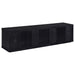 This sleek fireplace media console brings warmth and streamlined storage to contemporary living spaces. A wide electric firebox glows over crushed acrylic crystals, offering fifteen customizable flame colors operated by a wireless remote. Open side compartments with adjustable shelves store devices or décor, while rear cable management cutouts keep wires out of sight. Finished in classic black and crafted from engineered wood with a laminate veneer, it serves as a refined TV stand or entertainment center. Please note that this console does not include a heat function.