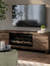 Nostalgic style, retooled for today’s trends. This TV stand with electric fireplace puts an elevated twist on mod aesthetics. Its warm brown tones reflect the mid-century vibes you love, while the angular base incorporates contemporary motifs. Integrated drawer handles round out the look in sleek style. For added ambiance, the electric fireplace brings a cozy-cool vibe to your living room. With the touch of a button, activate the LED-lit flame and adjust the temperature or the flame brightness. The flame effect includes multiple color options and a realistic-looking faux birch log set.