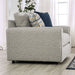 Simplicity is the name of the game with this chair. You'd appreciate the clean lines from the round wooden legs to the rounded armrests lined with welt trim. The back cushions are loose pillows that are easily removed for cleaning. Pops of colorful and playful lines are found on the pillows, giving this chair a friendly and approachable personality--the navy and gold accents popping against the neutral gray linen-like fabric.
