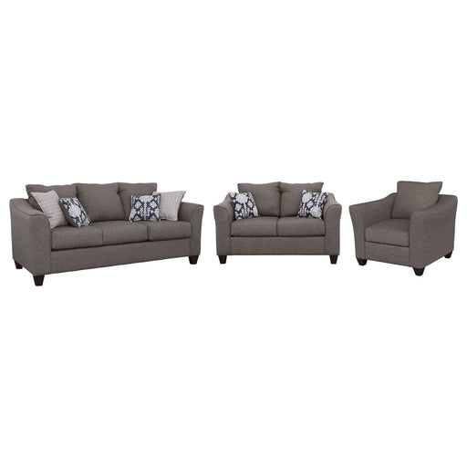 CoasterApproachable style pairs with tailored elegance in a three-piece modern sofa set. Light grey upholstery is a lovely neutral, while patterned accent...