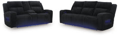 Trend-right style, meet irresistible modern function. Your living room gets a cozy-cool upgrade with this power reclining seating package. Curl up in its ultra-chic corded fabric and recline with one-touch controls. Is it movie night or game time? With ambient LED lighting, this set transforms from a serene relaxation spot to an entertainment hub. USB charging, cup holders and storage cutouts make lounging all the more convenient.