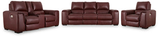 Impressive in scale while keeping an air of refinement, this power reclining package stuns with a soft, supple combination of leather and faux leather upholstery in garnet. Sink into real leather in the seating areas and inside backs while catering to your comfort with one-touch power reclining and adjustable headrests. Complete with USB charging, this set makes a surefire statement in your contemporary living room.