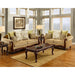 Traditional style and a modern mix of textures and patterns are the hallmarks of this stylish seating group. The tan fabric cushions and seat backs work with either a tan or espresso leatherette base. Beautiful floral patterns on the pillows top this traditional look.