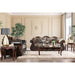 Visitors will wonder if they wandered into a palace when they enter and find this ornate love seat awaiting them. An elaborate wooden trim decorates the base and front of the rolled armrests and continues the frame to accentuate the top of the backrest. Sleek faux leather lines the flared arms and back while sumptuous chenille fabric covers the seat cushions in soft luxury. Resting atop elegantly turned bun feet, this sofa set will earn your decorating respect and grant your home a majestic air.