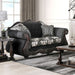 This salon-inspired sofa from the Ronja Collection will add sophistication to your living room. This sofa is one-of-a-kind, with a curvy design, button tufting, and dapper damask fabric on the reversible box cushions. Each plush cushion is encased in black welting, and the rolled arms feature wooden accents, creating an antique re?nement perfect for the focal point of your living room.