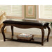 Distinctive S-shaped legs, curvy apron edges, and tobacco oak finish give this bench a welcoming look. An open shelf is there for display, and the seat is padded leatherette.