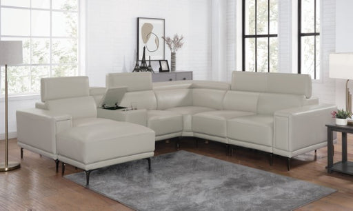 FurnitureOfAmericaModern design gets a tech update with this fun and innovative sectional upholstered in sleek leatherette. The neutral light gray tone is versatile ...