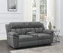 Settle down with a great book or kick up your feet watching your favorite team in the indulgent comfort of a transitional power reclining loveseat. Dual recliners are divided with a storage console, offering a spot to stash remotes and other essentials, and a pair of cupholders for beverages. Soft charcoal upholstery offers a neutral color palette to coordinate with surrounding decor, and offers inviting style. Extra-plush cushions and pillowtop arms bring inviting, indulgent comfort, perfect for a relaxing family room. Power recline mechanisms are operated with the touch of a button, ensuring smooth, seamless performance.