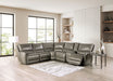 Suitable for any modern home, this gray sectional will liven up any living room it graces. It starts with the materials upholstered in top grain leather, the frame within is made of kiln-dried hardwood, corner blocked for maximum durability. High density foam and a no sag suspension go underneath each seat, with heavy duty reclining mechanisms controlled by a simple touch of a button. The L-shaped sectional offers plenty of seats with zero gravity position and extendable footrests for everyone to stretch out and relax. Designed to stay off the wall even with just three-inch space, its the kind of furniture that takes into account the intricacies of living in a more modest space.
