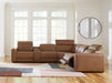 Details Includes 6 modular pieces: left-arm facing power recliner, power armless recliner, console with storage, armless chair with manual headrest, wedge and right-arm facing power recliner, "Left-arm" and "right-arm" describe the position of the arm when you face the piece, Versatile modular pieces fit together in a variety of configurations, One-touch power control with adjustable positions, Easy View™ adjustable headrest and zero-draw USB-A and USB-C ports, Zero-draw technology only consumes power when the USB receptacle is in use, Extended ottoman for enhanced comfort, Corner-blocked frame, Attached cushions; high-quality foam cushions wrapped in poly fiber, 100% top grain leather covers inside areas such as the back, seat and arm cushions; skillfully matched faux leather covers the remaining areas, Due to its natural origin, real leather can show individual characteristics such as healed scars, growth marks, grain variation and shade variation, Natural variations make each hide unique and do not detract from the wearing qualities of leather, Storage console with 2 cup holders and wireless charging; 2-stage cup holder converts to a flat surface for coffee mugs, Power cord included; UL Listed