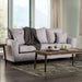A unique combination of casualness and charm is the bread and butter of this sofa. It features ever-so-slightly flared arms, rounded for maximum comfort. The back consists of loose pillows, which along with the accent pillows, are easily arranged to suit one's preferences. The simple tapered block legs are black and made of plastic for an innocuous look. It's upholstered all around in a light gray fabric that's airy and definitely inviting.