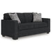 This stunning sofa leaves a lasting impression. Its cozy cushions, chic coal-colored upholstery and striking nailhead trim are a perfect blend of comfort and contemporary design. And here’s the showstopper—ambient red, white and blue LED lighting along the sofa's base. The look is simply wow.